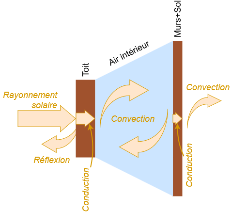 Pour déterminer la portion de cette irradiance absorbée par le toit, on mesure, avec le même appareil, celle réfléchie par la toiture : \(300\;\text{W/m}^2\) pour le toit blanc, \(55\;\text{W/m}^2\) pour le toit noir.