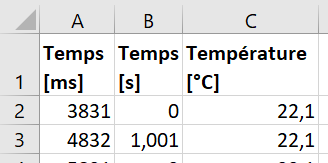 Insérer une colonne entre le temps en millisecondes et la température, et à l’aide d’une formule, la remplir avec le temps, exprimé en seconde, et de telle sorte qu’il commence à zéro.