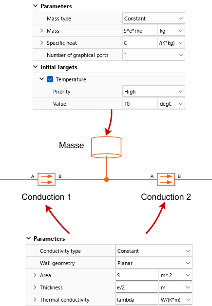 Pour modéliser le comportement thermique d’une maison d’habitation, selon un modèle unidimensionnel (tel que Simscape), on considère la maison comme un ensemble de 3 types de parois en parallèle, possédant chacune leurs propriétés (matériau, surface, épaisseur).