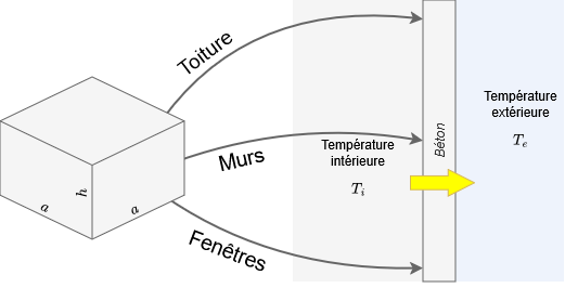 De part et d’autre de cet ensemble de parois, une certaine quantité d’air (finie, masse constante) à l’intérieur, et une quantité d’air infinie à l’extérieur (température constante).